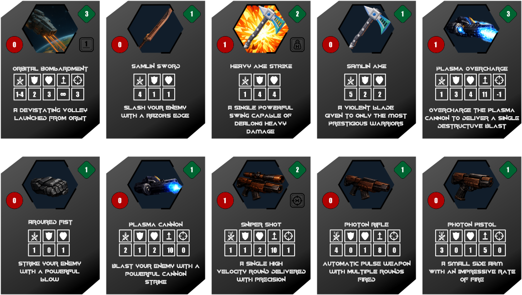 Above you can see the class cards for the miniatures available witin the Starsapien faction. Each class of Starsapien then exposes options for actions and equipment that can be deployed on the field of battle through command-cards. A number of these can be seen below.